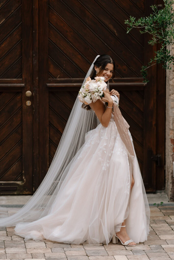 Die Braut und ihre Brautjungfern stehen barfuß am Pool, Sektgläser in der Hand, lachen und genießen den Moment. Während der Trauung erfüllt das Spiel einer Geigerin den Innenhof der Burg und schafft eine Atmosphäre voller Nähe und Emotion.